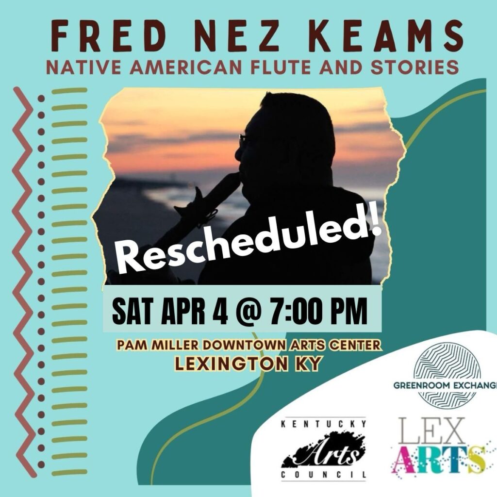 The Lowenthal Room on the third floor of the Pam Miller Downtown Arts Center where Fred Nez Keams show was being presented is closed for repairs. The good news is his show is rescheduled on APRIL 4 AT 7 PM IN THE BLACK BOX THEATER at the PAM MILLER DOWNTOWN ARTS CENTER.